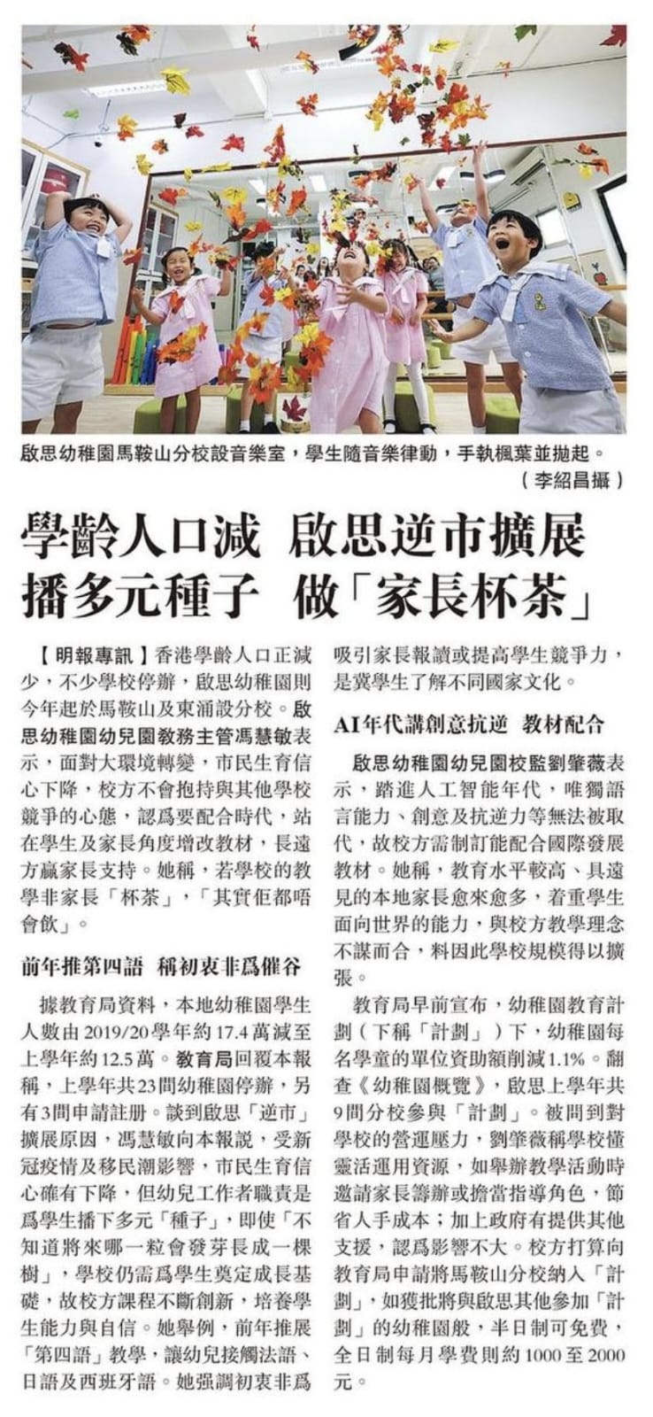 據教育局資料,本地幼稚園學生人數由2019/20學年約17.4萬減至上學年約12.5萬。教育局回覆本報稱,上學年共23間幼稚園停辦,另有3間申請註冊。談到啟思「逆市」擴展原因,馮慧敏向本報說,受新冠疫情及移民潮影響,市民生育信心確有下降,但幼兒工作者職責是為學生播下多元「種子」,即使「不知道將來哪一粒會發芽長成一棵樹」,學校仍需為學生奠定成長基礎,故校方課程不斷創新,培養學生能力與自信。她舉例,前年推展「第四語」教學,讓幼兒接觸法語、日語及西班牙語。她強調初衷非為吸引家長報讀或提高學生競爭力,是冀學生了解不同國家文化。